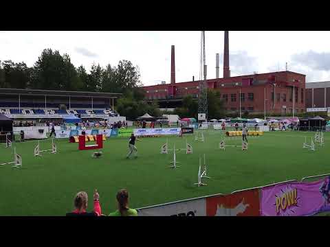 Kisa-aamuna muu porukka jäi hotelliin nukkumaan kun TIkrun kanssa suuntasimme kisoihin. Valitettavasti minua ennen lähteneet kaksi koirakkoa olivatkin poissa, ja koska en tätä tiennyt niin minulle tuli tosi kiire radalle. Olin kyllä tietoinen että kiire tulee, ja siksi Tikrun boksi oli niin lähellä kenttää kuin mahdollista. Kiire painoi kuitenkin päälle ja Tikru oli ihan hirveillä kierroksilla kentälle päin mennessä. Sain koiran ihan mukavasti kuulolle lähtökarsinassa, mutta kun tulimme radalle lähtöön niin kiire näkyi koiran itsevarmuuden katoamisena. Se on jännä miten muutaman metrin aikana kerkeää radalla miettiä vaikka ja mitä. Kun suorastaan lapioin Tikrua yli ensimmäisen ja toisen esteen niin väänsin itkua kolmannella hypyllä. Mietin mielessäni että näinkö me nolataan itsemme ja tällainen ratako tästä nyt tuli. Neljännellä hypyllä sisuunnuin ja päätin että me ei anneta periksi, vaan näytetään että kyllä mekin osataan. Tikrulla meni vielä muutama este oikeaa virettä löytäessä, mutta lopulta mentiin noin puolet hyvällä vauhdilla ja yhdessä tehden. Tuloksena radalta 0 virhettä, ja jonkin aikaa saimme olla tuloslistan kärjessäkin. Etenemältään suoritus oli 3,7m/s mikä on paljon enemmän kuin viime vuonna (3,3m/s). Oikeita asioita ollaan siis tehty. Tuloksena 91/161.